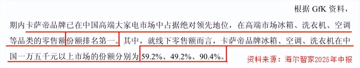 时至今日,卡萨帝已经连续8年稳居高端家电TOP1。在2025年上半年,卡萨帝冰箱、洗衣机和空调在国内一万五千元以上的市场份额最高甚至达到了90.4%。