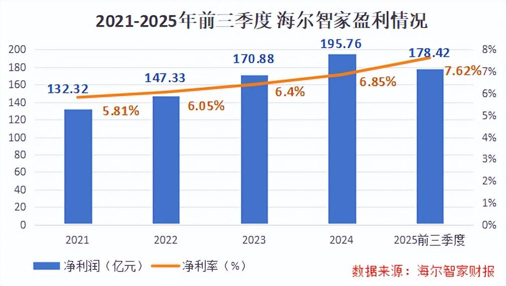 费用端一系列的优化显著提升了海尔的盈利能力。2025年前三季度,公司实现营业收入2340.54亿,净利润178亿,净利率从2021年的5.81%提高到了如今的7.62%。