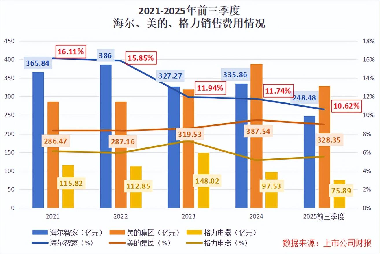但局面从2023年起开始扭转,彼时海尔的销售费用已降至327亿,到2025年前三季度,公司销售费用率甚至到了10%左右,而美的和格力则基本维持原状,波动不大。
