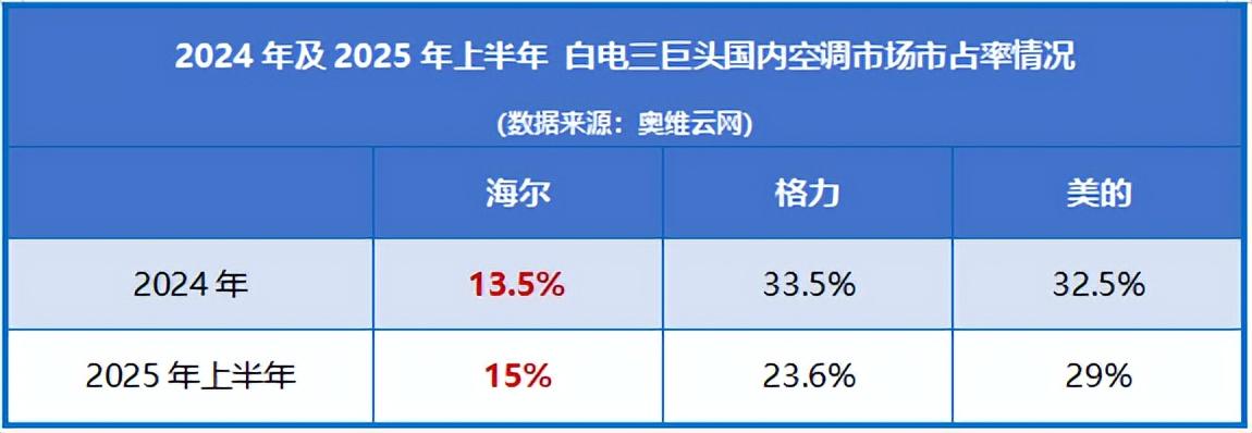 2024年,海尔智家国内空调市占率仅为13.5%,但到了2025年上半年已跃升至15%,与此同时,格力和美的却双双下滑到了30%以下。