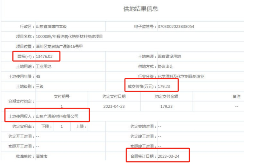 2023年3月24日,长裕集团子公司广通新材料(下或以长裕集团概指)获得了一块工业土地。据淄川区龙泉镇广通路16号甲土地出让结果公示(协议出让)显示,该处工业用地位于淄川区龙泉镇广通路16号甲,土地级别三级,面积为13476.02平方米,供地方式为协议出让,约定支付金额179.23万元。