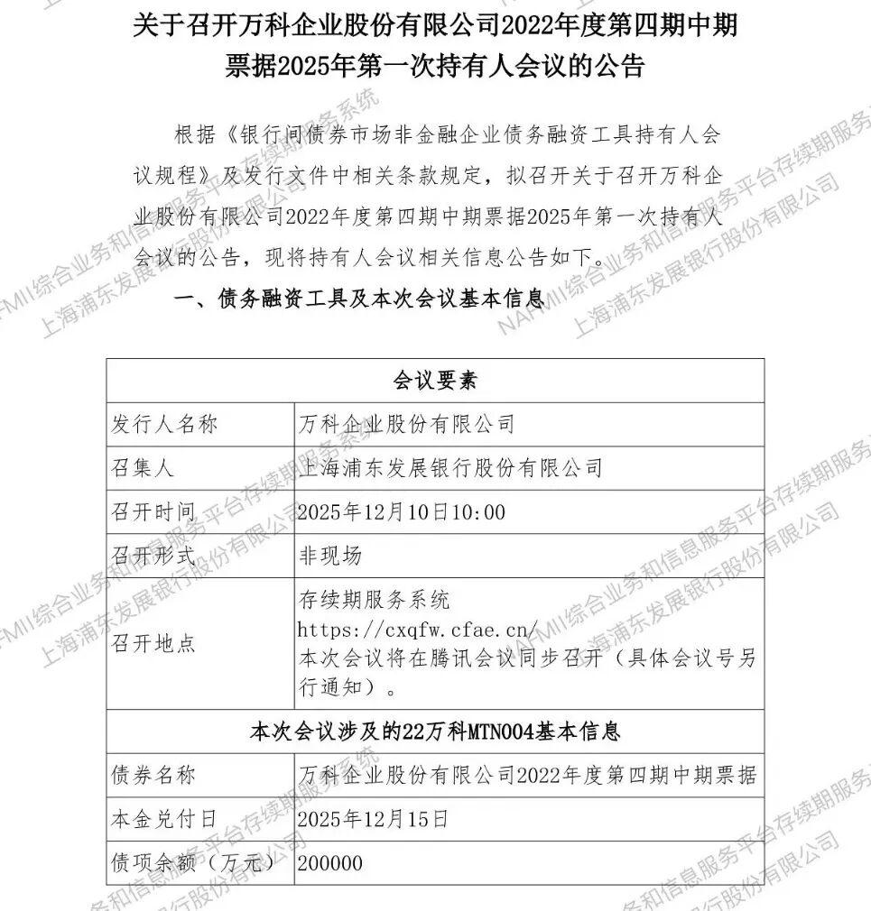 《关于召开万科企业股份有限公司2022年度第四期中期票据2025年第一次持有人会议》的公告显示,会议定于12月10日上午十点召开,核心议题正是审议“22万科MTN004”的展期事项。
