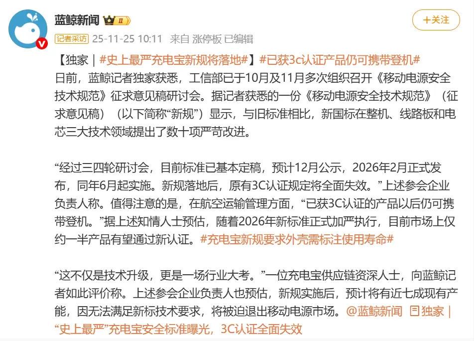 11月25日,有媒体报道工信部关于《移动电源安全技术规范》新国标已基本定稿,将于2026年6月起正式实施。新规落地后,沿用多年的原有3C认证将全面失效。