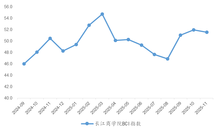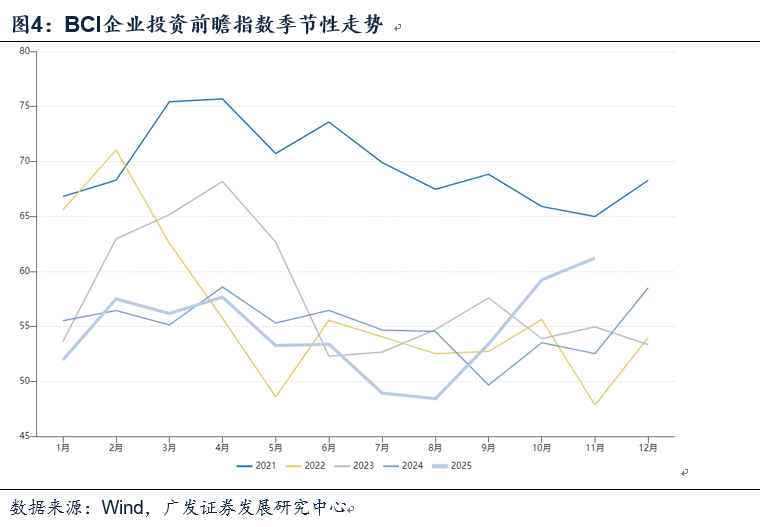 11月BCI为51.6,稍低于前值的52.0,但仍属下半年次高位。考虑到BCI兼有环比和同比特征,10月是低基数,11月是“924”政策密集落地影响下的高基数,这一表现更是有些超预期。从BCI复盘经济节奏,今年一季度BCI延续修复进程,3月达到年内高点;二季度在外部关税扰动下初步下台阶;在投资收缩影响下,7-8月下滑较快,引发广义财政于9月底开始密集落地。9月BCI环比回升明显,10-11月进一步略高于9月。