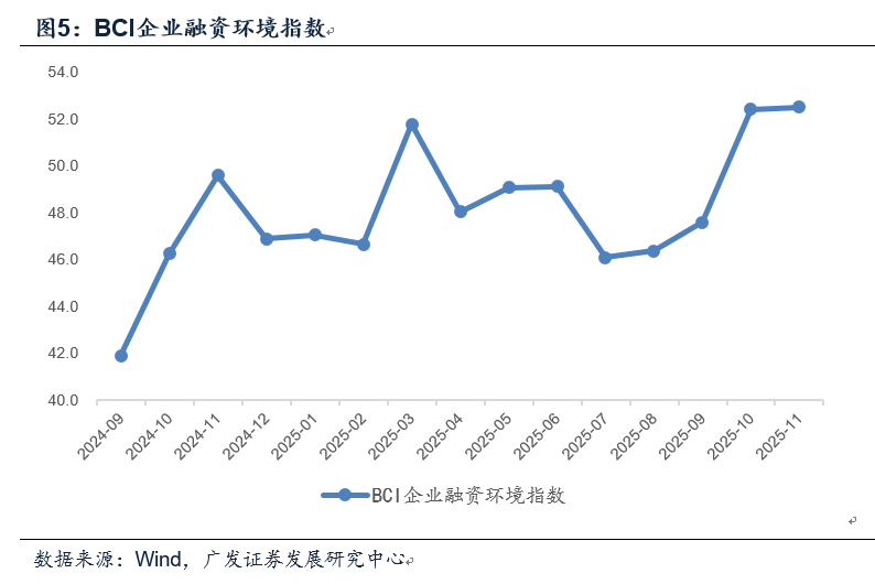 第一,11月BCI为51.6,稍低于前值的52.0,但仍属下半年次高位。考虑到BCI兼有环比和同比特征,10月是低基数,11月是“924”政策密集落地影响下的高基数,这一表现更是有些超预期。从BCI复盘经济节奏,今年一季度BCI延续修复进程,3月达到年内高点;二季度在外部关税扰动下初步下台阶;在投资收缩影响下,7-8月下滑较快,引发广义财政于9月底开始密集落地。9月BCI环比回升明显,10-11月进一步略高于9月。