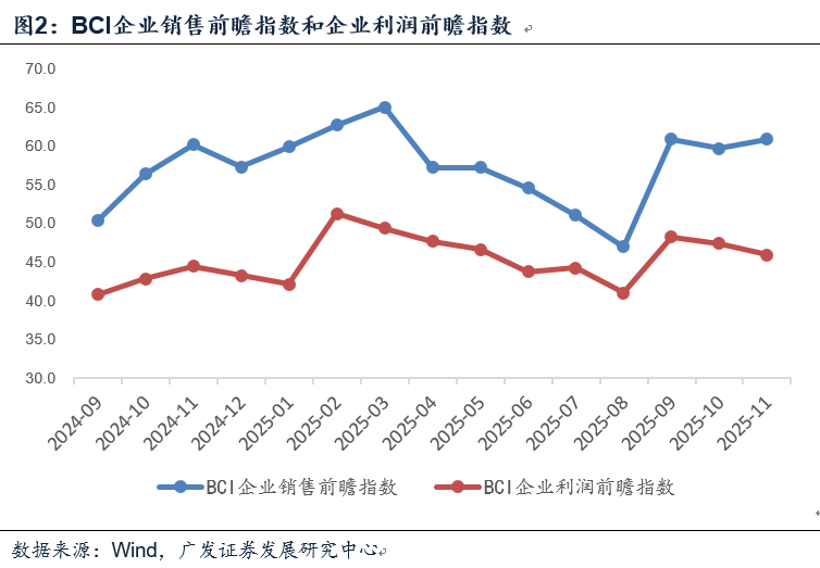 11月企业销售前瞻指数为60.9,高于前值的59.7。利润前瞻指数为45.9,低于前值的47.4。
