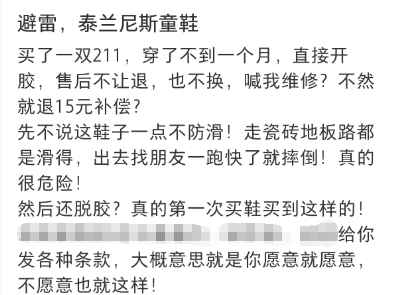 近期,有用户在社交平台发布“避雷贴”,认为泰兰尼斯童鞋产品与宣传不符,高价“割韭菜”。