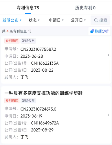 2023年6月,泰潼商贸还申请了“多功能足部测量鞋用收纳架”“足底按摩减震透气鞋垫”“一种具有多密度支撑功能的训练学步鞋”“一种橡胶鞋底用材料及其制备方法”几项发明专利,但其法律状态均为“专利撤回”。