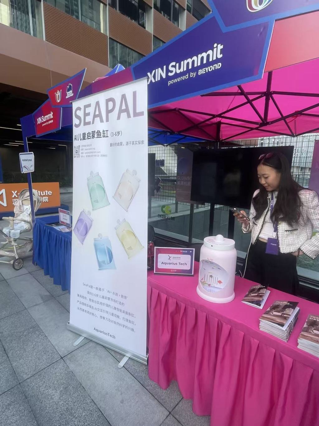 在XIN Summit现场,深圳科创学院孵化的学生创业团队在卖AI儿童鱼缸。 澎湃科技记者 喻琰 图