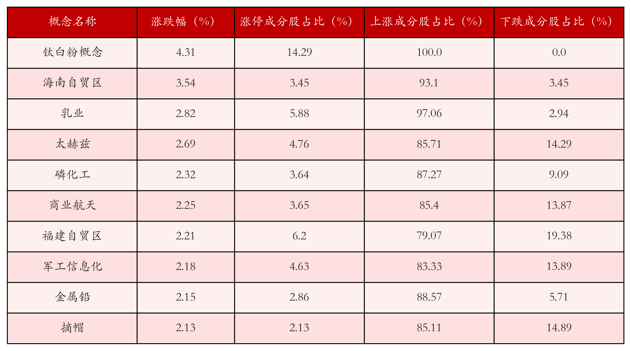 根据A股概念涨跌幅与所对应的股票池综合分析,涨幅靠前的三个概念板块分别为:钛白粉概念、海南自贸区与乳业。排名前10位的概念板块相关数据见下表:
