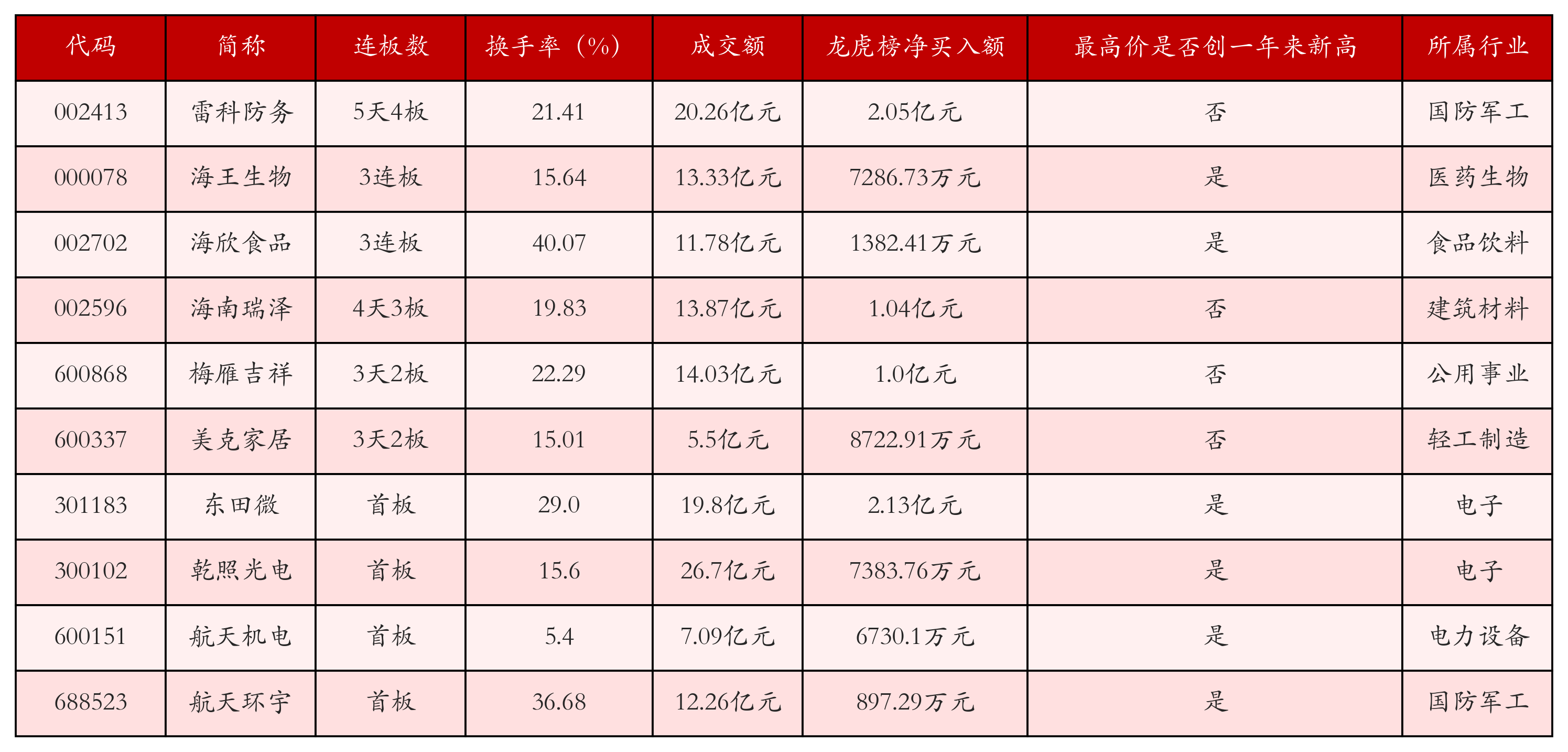 截至11月28日收盘,上证综指上涨0.34%,收于3888.6点,深证成指上涨0.85%,收于12984.08点,创业板指上涨0.7%,收于3052.59点。今日沪深两市A股共计82只涨停,综合当前连板数以及当日龙虎榜数据,其中较为强势的前三只个股分别为:雷科防务(002413)、海王生物(000078)与海欣食品(002702)。今日强势个股前10位具体数据见下表: