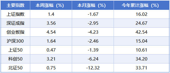 指数层面,本周A股主要指数悉数反弹,其中创业板指、深证成指、科创50等指数涨幅居前,本周累计上涨分别达到4.54%、3.56%、3.21%,显示出科技板块仍为本轮反弹的先锋。从年度表现来看,创业板指今年以来累计涨幅达到42.54%,处于领跑位置;紧随其后的是科创50和北证50指数,今年以来累计涨幅分别为34.20%、33.71%。