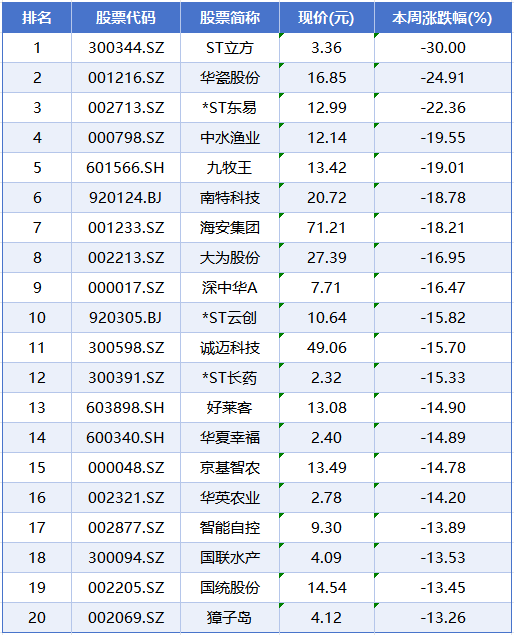 本周个股跌幅榜前五位分别是ST立方、华瓷股份、*ST东易、中水渔业、九牧王,累计跌幅分别为30%、24.91%、22.36%、19.55%、19.01%。