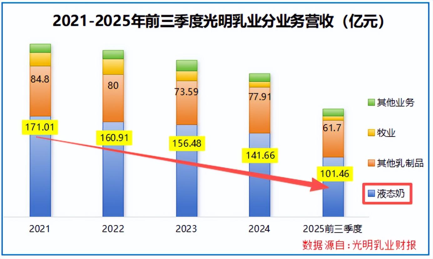 这一点,直接反映在光明乳业的核心业务上——液态奶持续萎缩。