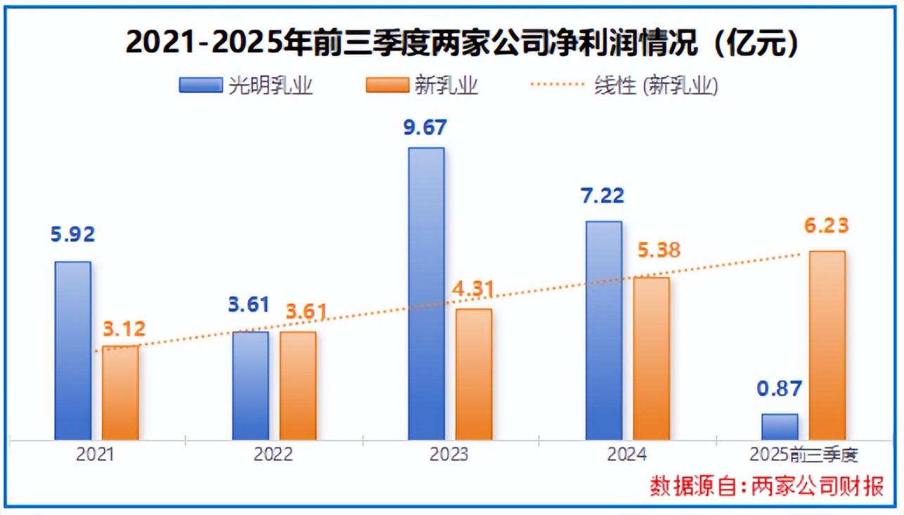 从业绩来看,2025年前三季度,光明乳业净利润仅8721万元,单三季度更是净亏1.3亿元。反观新乳业前三季度净利润达6.23亿元,同比增长31.48%。