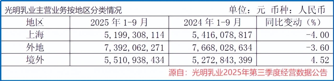 光明乳业上海大本营贡献了52亿元营收,同比下滑4%;中国其他地区74亿元的营收也同比降了3.6%。
