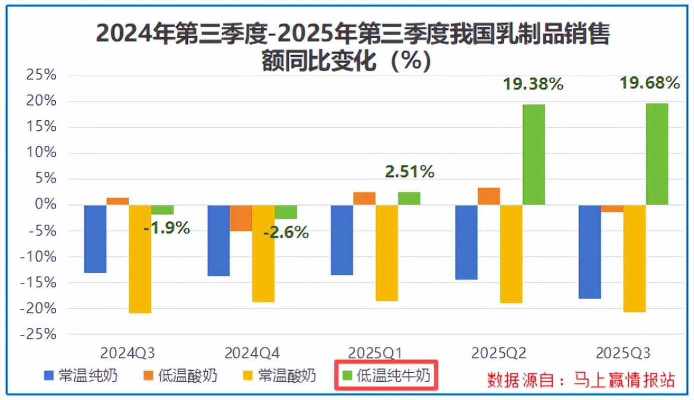 2024年第三季度到2025年第三季度,国内低温纯牛奶的销售额同比涨幅,明显超过常温纯奶等传统品类,渗透率也一直在涨。