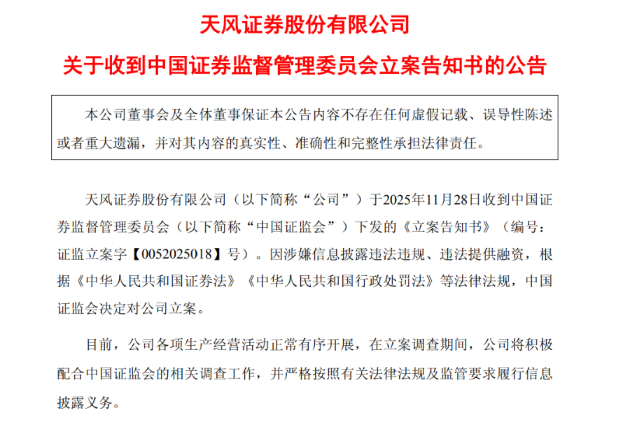 11月28日晚间,天风证券(601162.SH)突发公告称,因涉嫌信息披露违法违规、违法提供融资,证监会决定对公司立案。目前,公司各项生产经营活动正常有序开展。