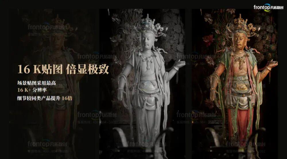 同样来自广州的凡拓数创,通过AI三维重建技术复原明代“小西天”寺庙,原本20人需2年的工作,2个月就完成,16K超清模型连佛衣纹理、光影变化都纤毫毕现。