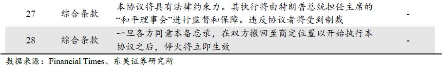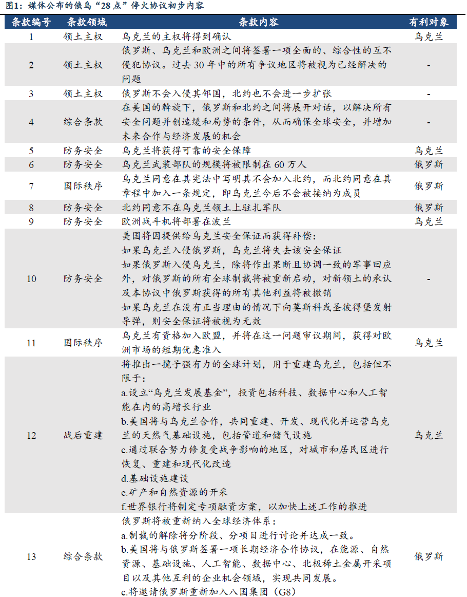 前景展望:俄乌核心争议仍未解决,未来和平之路依旧漫长。就最新的公开信息而言,该停火协议的推进仍面临诸多现实问题:①乌克兰对核心领土的底线难以逾越。乌克兰宪法规定,克里米亚、卢甘斯克和顿涅茨克为乌克兰“不可分割的领土”,总统无权承认领土割让,否则将违反宪法并构成叛国罪。因此放弃对上述核心领土的宣称,将对乌克兰民族认同和泽连斯基政权执政合法性产生巨大动摇。②乌克兰政治制度令诸多条款难以落地。除核心领土外,协议要求将禁止加入北约等内容写入乌克兰宪法,以确保条款后续的实施。但由于乌克兰宪法规定处于战时戒严状态时不得对宪法进行修改,且此类涉及国家安全的宪法内容修改均需经过乌克兰全民公投通过。这使得停火协议内容实现的前提是俄乌双方“已经”实现停火,这一“逻辑闭环”使得诸多和平协议条款的实现都将面临乌克兰国家内部“违宪”的风险。③对欧洲战略地位的忽视令未来地缘局势面临不确定性。禁止乌克兰加入北约、欧洲对乌克兰额外增加投资以帮助战后重建等条款并未将欧洲视为未来安全框架的制度性参与者,而更多作为财政责任的“承担者”。这使欧洲在俄乌冲突结束后难以达成对乌克兰的长期安全承诺,地区地缘局势未来仍将面临较大的不确定性。因此综上所述,该和平协议并未能够解决俄乌双方之间的核心争议,其仍需要进一步的多边磋商与修改,俄乌冲突的和平之路未来依旧漫长。