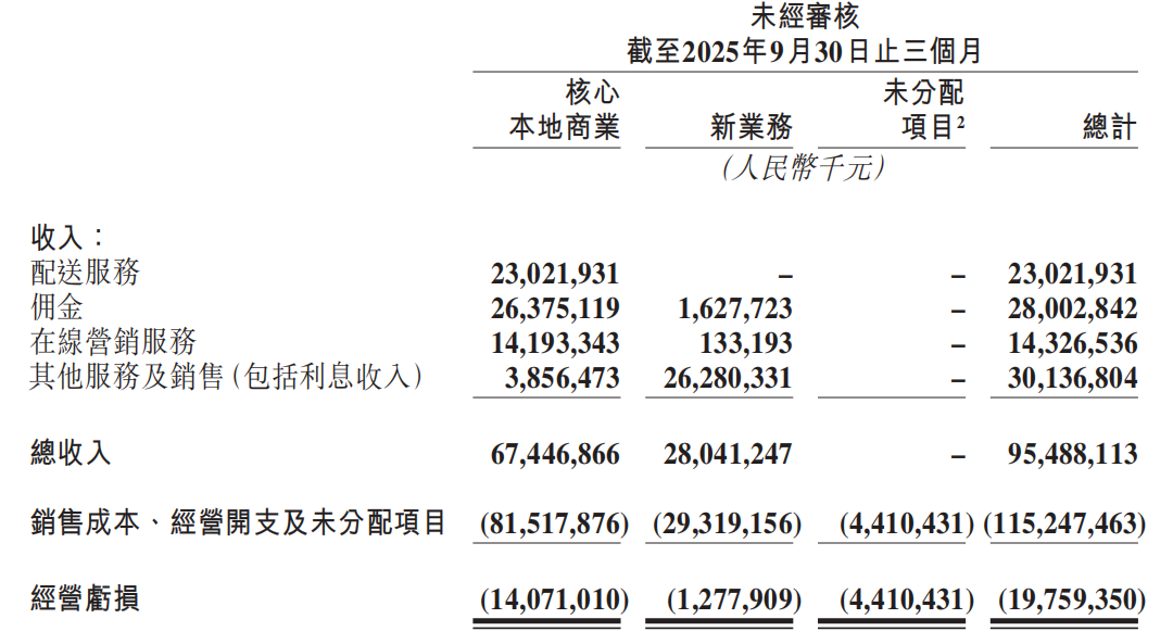 整体来看,三季度美团经营亏损197.59亿元,经营亏损率20.7%;期内亏损186.32亿元,亏损率19.5%;经调整EBITDA为亏损148.42 亿元,经调整亏损为160.10亿元。