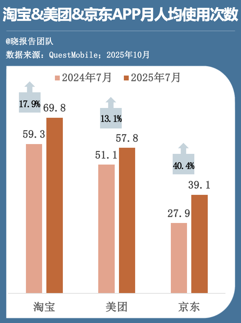 而于平台来说,更为关键是,一方面,这场大战为主流电商注入了久违的增长活力。据QuestMobile数据,单7月,淘宝APP、美团、京东的月人均使用次数,就比去年同期分别增长了17.9%、13.1%、40.4%,这是过去存量时代难以想象的增量。