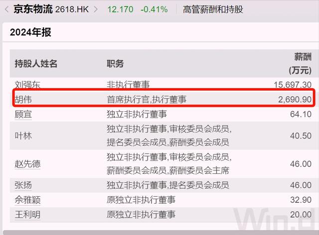 根据京东物流年报披露,胡伟税前薪酬接近2700万元,比2023年增加约1200万元,并持有531万股。按照京东物流最新股价12.2港元测算,价值大约6500万港元。