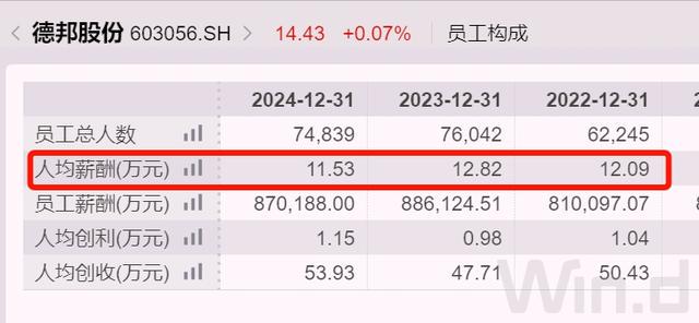 截至2024年末,德邦股份的员工近7.5万人,去年人均创利1.2万元,人均税前薪酬11.5万元,比2023年减少大约1.3万元。