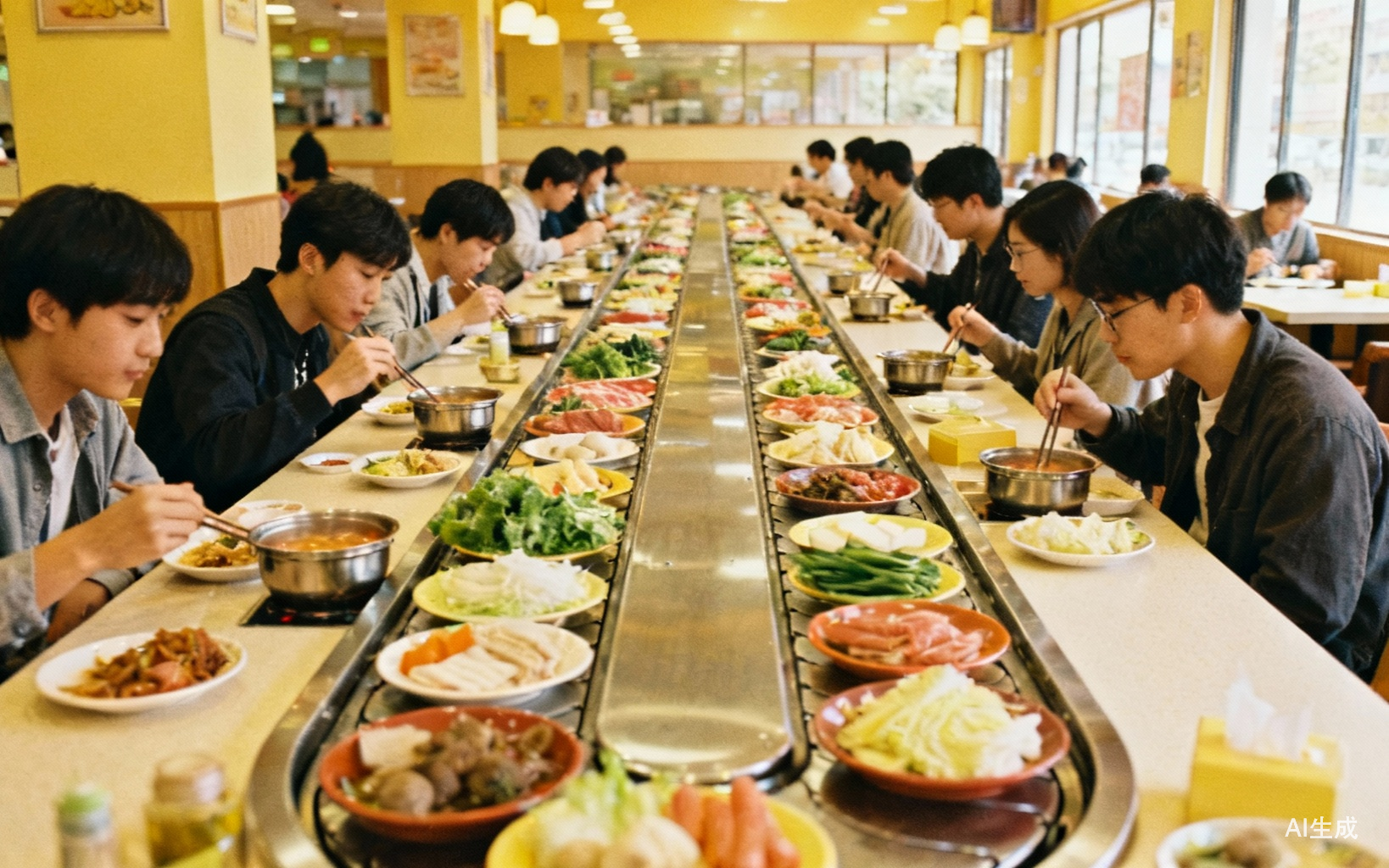 这种借鉴于日本回转寿司模式的火锅餐厅,借助传送带自动将各种菜品送到顾客餐桌上,省去了传统火锅店里顾客点菜、员工传菜等步骤。