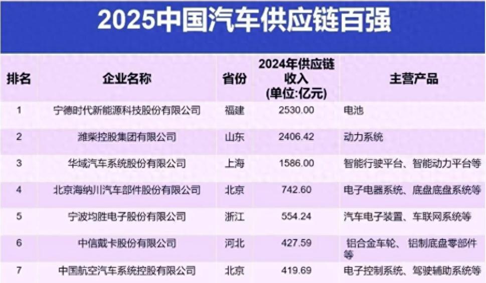 在中国汽车报发布的《2025中国汽车供应链百强》中,2024年度汽车供应链收入超过2000亿元的汽配集团就有2家,分别是宁德时代(2530亿元)和潍柴控股(2406.42亿元)。