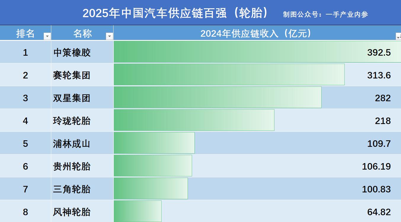 在2024年度中策橡胶集团,汽车供应链收入为392.5亿元,在中国汽车供应链百强榜中位列第8位,轮胎行业首位。