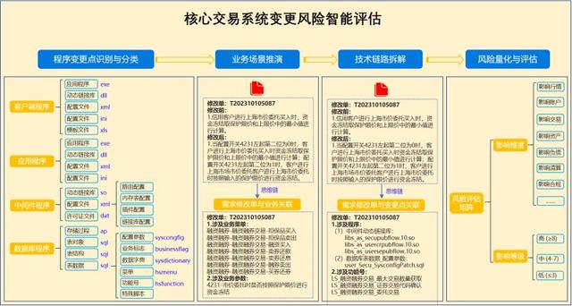 核心交易系统每次升级涉及数千甚至上万个修改点,涉及变更点多、业务面广、关联系统众多,传统基于人工经验的分析方法难以全面、精准地评估变更点对相关模块、接口、参数、表数据、业务功能以及业务流程的潜在影响,存在漏判、误判风险,为系统稳定运行埋下隐患。