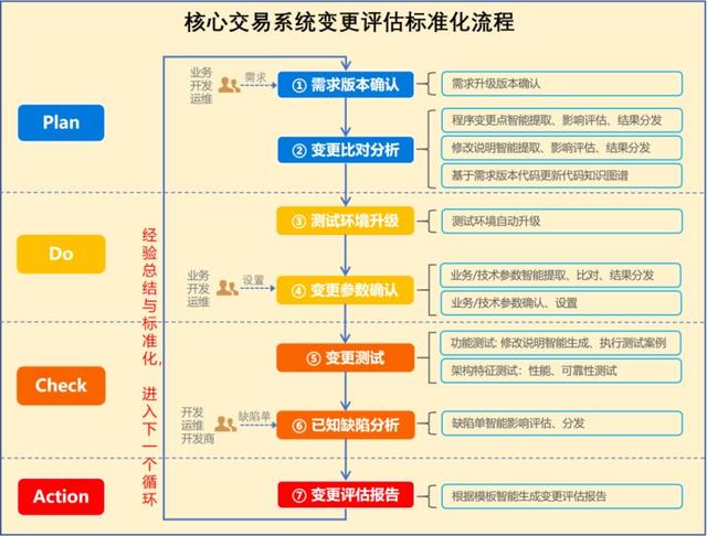 引入PDCA循环(戴明环)方法论,在公司现有变更实施平台基础上,拓展需求确认、变更比对、测试升级、参数确认、缺陷分析、变更报告生成等功能,形成覆盖变更评估全流程的标准化、平台化管理体系,降低对个人经验的依赖,实现知识的体系化沉淀与复用。