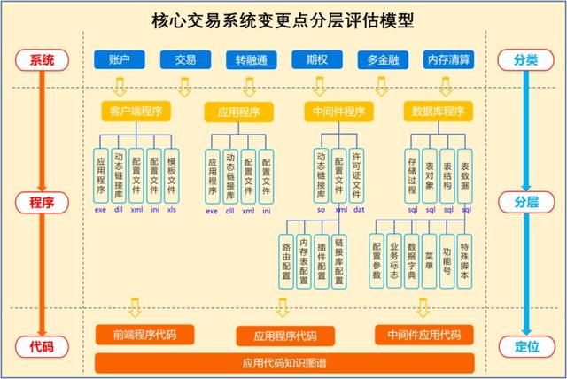 基于Jurgen Appelo复杂系统控制理论中的分解、分层、抽象方法,结合公司多年变更管理实践,构建了核心交易系统变更点分层评估模型。该模型从子系统、程序项、代码等多个维度对变更点进行定类、分层与定位分析,为变更点评估提供结构化框架。