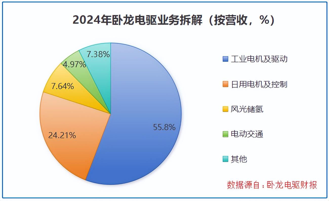 拆解卧龙电驱的业务版图可见,工业电机和日用电机仍是其核心支柱,2024年两者合计营收占比高达80%,风光储氢业务则以7.64%的占比位列第三。