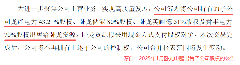 其次,卧龙电驱主动做减法,于2025年1月以7.2亿元卖掉了龙能电力、卧龙储能等四家新能源子公司的股权。这一举措直接导致短期合并报表范围缩小,影响了营收规模。