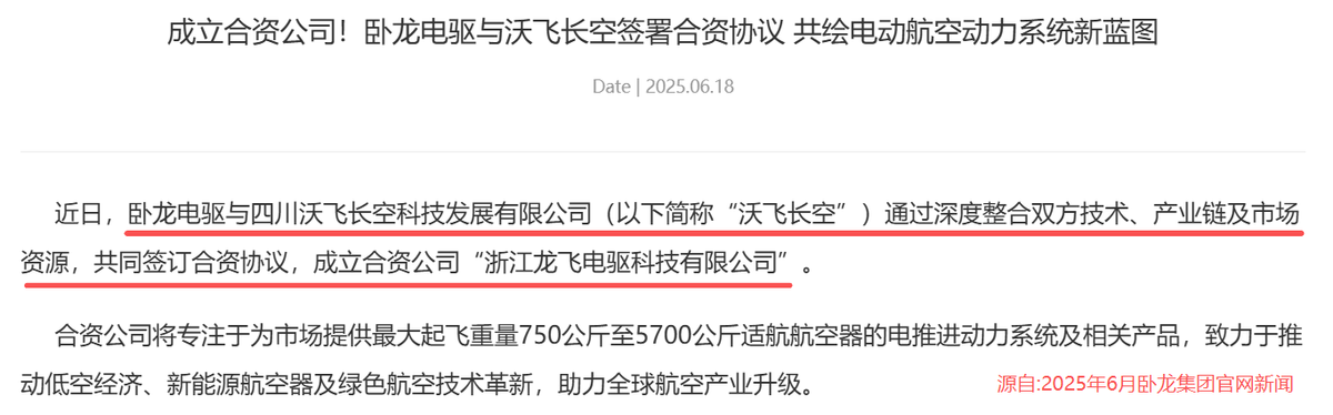 2025年6月,公司再落关键一子,与沃飞长空合资成立新公司,专攻750kg至5700kg适航航空器的电推动系统。
