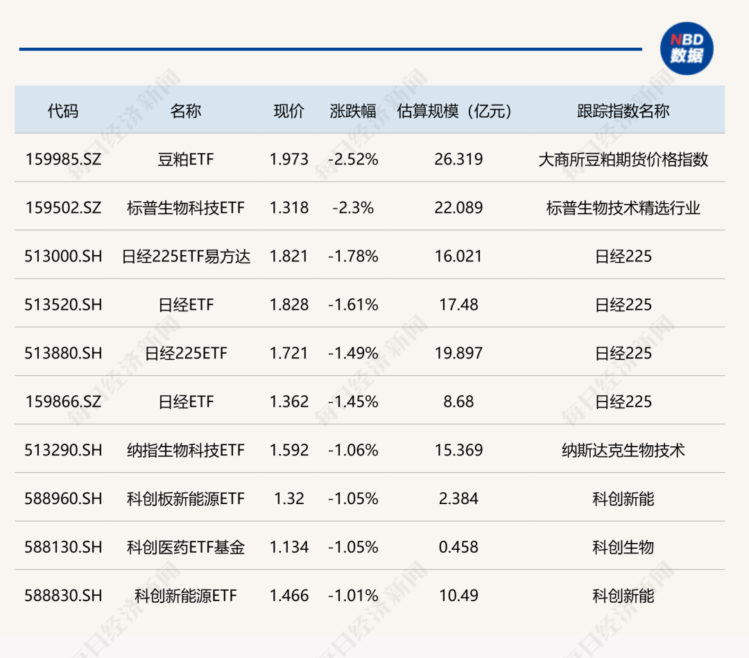 下跌方面,豆粕ETF、标普生物科技ETF跌超2%。