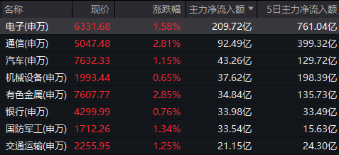 实时数据来看,主力资金扎堆流入的仍是上周就表现活跃的电子、通信等行业;汽车、有色金属、国防军工等方向亦持续有资金流入。