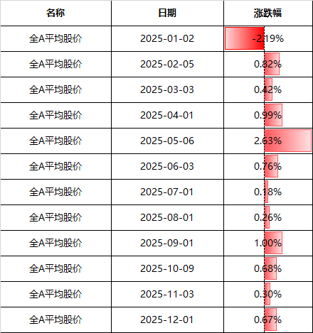 Wind数据显示,全A平均股价只在1月2日是收跌的,后面11个月都有开门红。