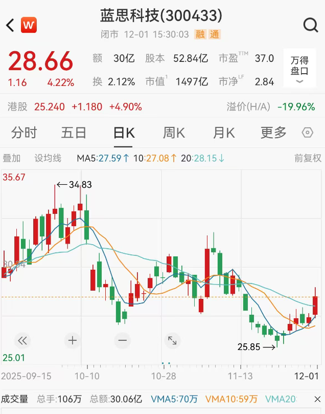 截至12月1日收盘,蓝思科技每股报28.66元,最新市值为1497亿元。
