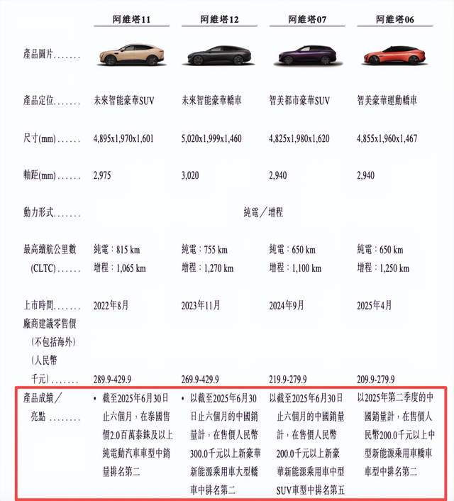 以截至2025年6月30日止六个月的中国销量计,阿维塔12在售价人民币 30万元以上新豪华新能源乘用车大型轿车中排名第二。阿维塔07在售价20万元以上新豪华新能源乘用车中型SUV车型中排名第五。