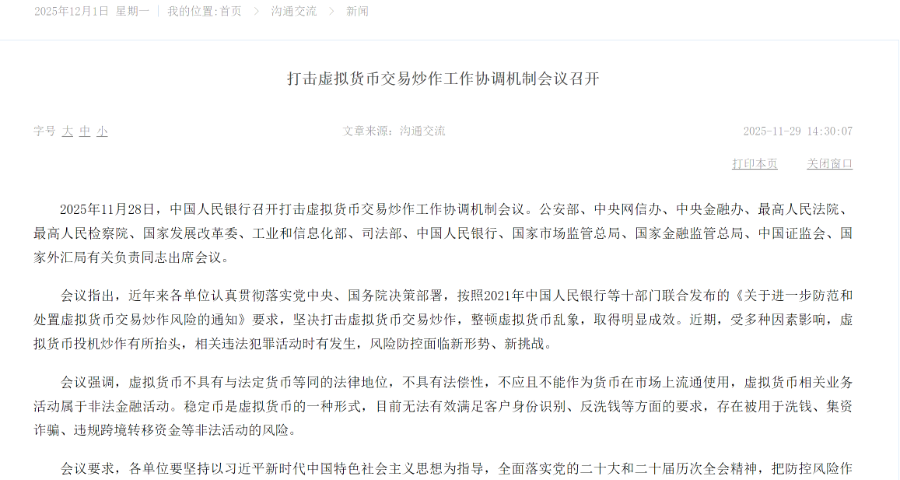 央行召开打击虚拟货币交易炒作工作协调机制会议,来源:央行官网