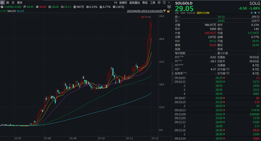 上述要约收购提出后,索尔黄金股价连续大幅上涨,从11月21日的20.1便士一度升至11月28日的30.77便士。