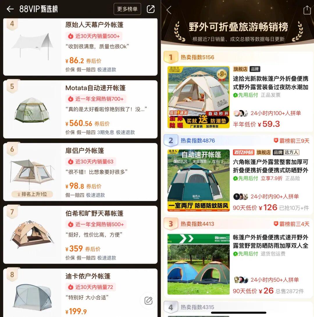 左图为天猫,右图为拼多多,迪卡侬最便宜的帐篷199元,并没有价格优势