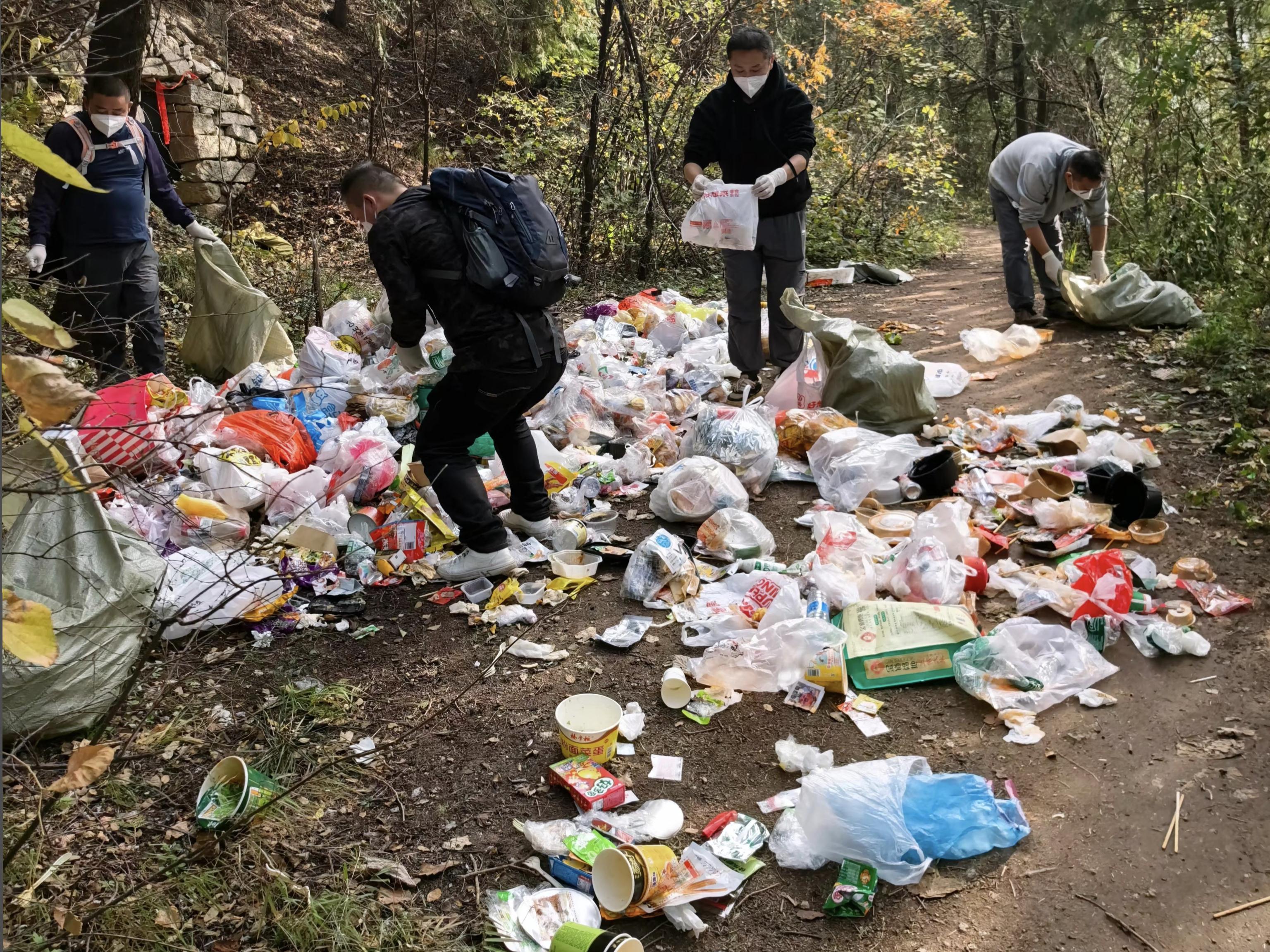近两年,陕西西安的徒步爱好者黄先生每周都会组织6到8名户外爱好者到秦岭各个“野山头”捡垃圾2至3次,每次能捡回约200斤垃圾,“都是徒步爬山的人丢的”。