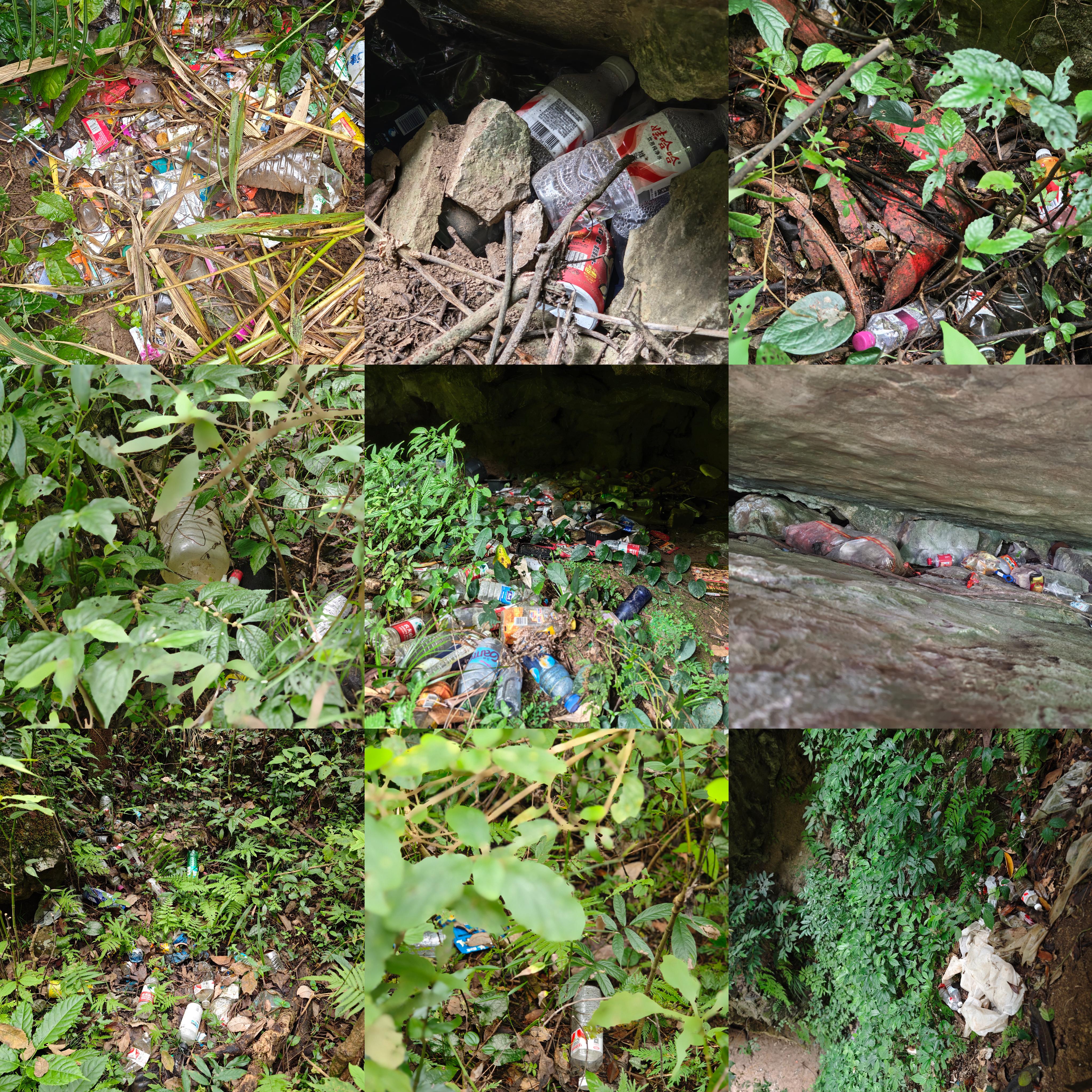 瀑布下游林间的一处天然洞穴内,堆积着数十个一次性餐盒、塑料水杯、玻璃瓶和矿泉水瓶;洞穴对面的石缝中,可见一大袋垃圾和多个塑料水瓶、易拉罐。在一条小路旁的林间,枯树枝下有不少塑料瓶、易拉罐,垃圾焚烧后的黑色残留物夹杂其间。
