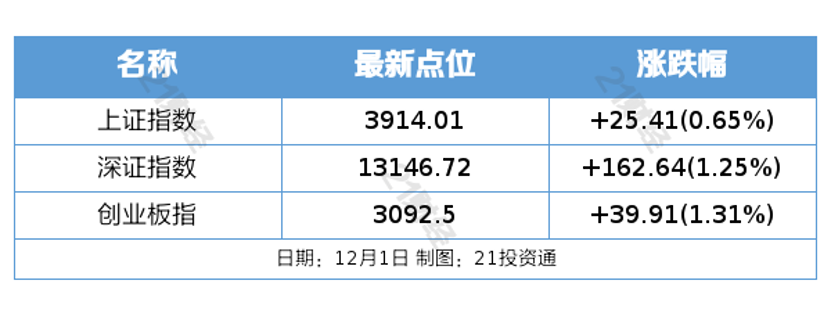 12月1日,市场震荡拉升,沪指重返3900点上方,深成指、创业板指均涨超1%。截至收盘,沪指涨0.65%,深成指涨1.25%,创业板指涨1.31%。沪深两市成交额1.87万亿元,较上一个交易日放量2881亿元。