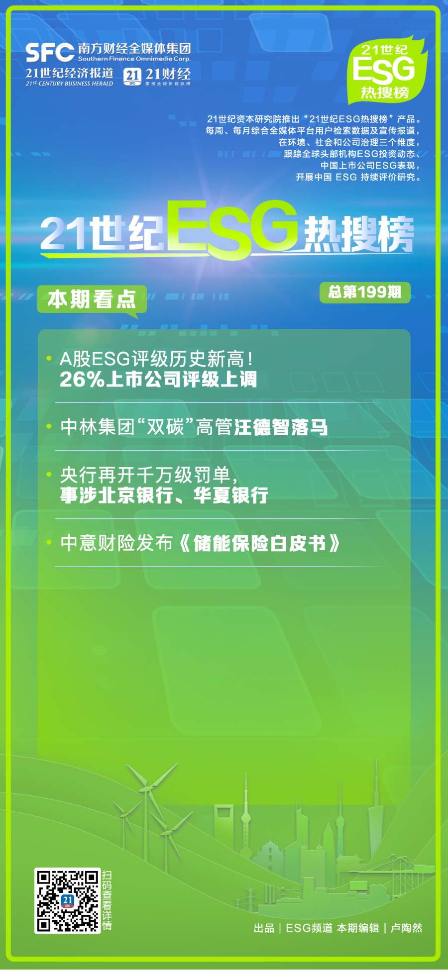 A股ESG评级历史新高;央行再开千万级罚单|ESG热搜榜
