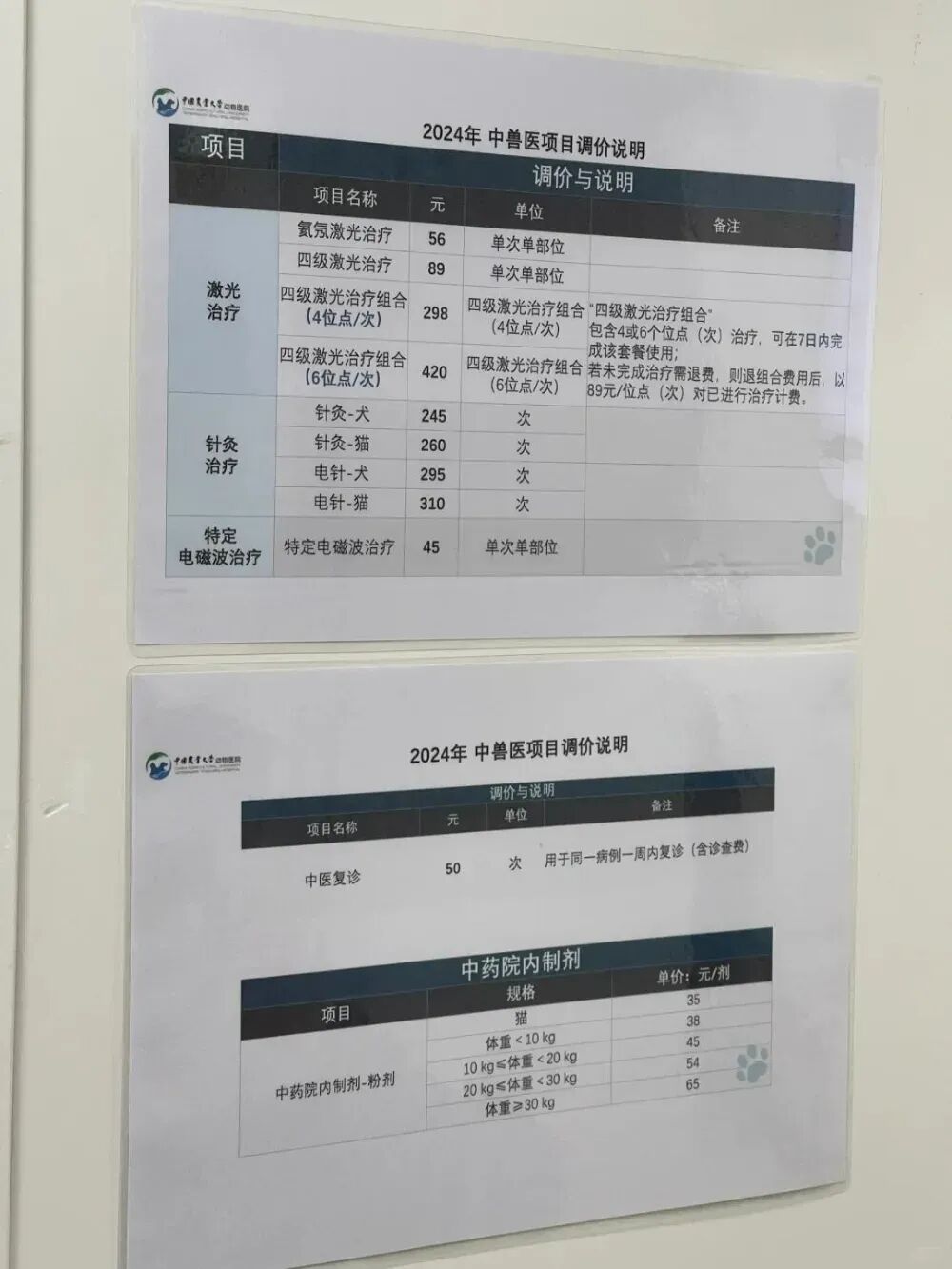 除了针灸,中农动物医院的中兽医诊室还有包括激光、电磁波、中药制剂多种治疗方法,其中针灸项目主要针对猫、犬类动物,费用在200-260元不等,如果病情干预需要电针,价格会略有上浮,但所有收费也是全部“明码标价”,就坦荡荡地贴在墙上。